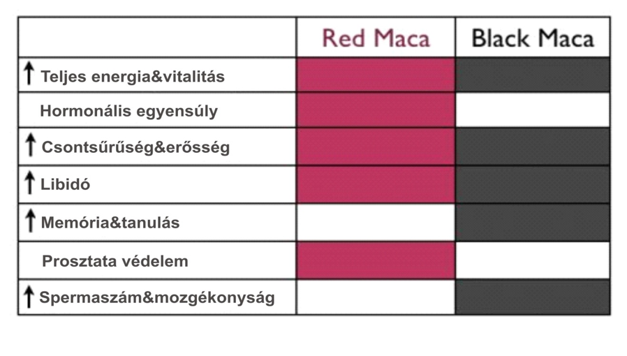 A jelenlegi tudományos bizonyítékok alapján egy egyszerű táblázatban összegeztük a vörös és a fekete maca hatásait. Válasszon igényei alapján!